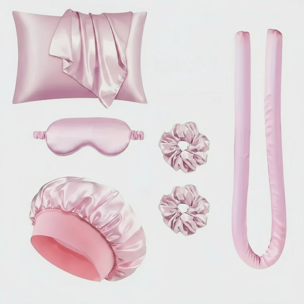 Découvrez le kit de coiffure en soie, un coffret beauté complet pensé pour boucler, protéger et sublimer vos cheveux naturellement pendant la nuit.